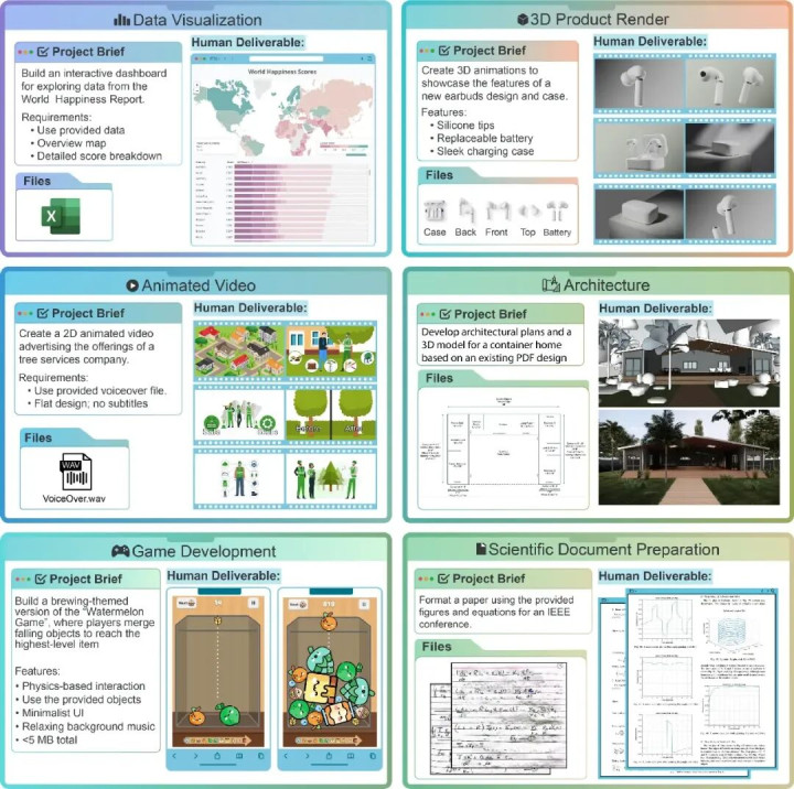 现实中,甲方突然要求改语气、换配图风格;客户上传的参考资料缺页、压缩包损坏;或任务中途新增“请在Notion里同步进度并生成演示稿”。这些人类面对的模糊又多变的现实,是模型能力测试中不曾出现过的。